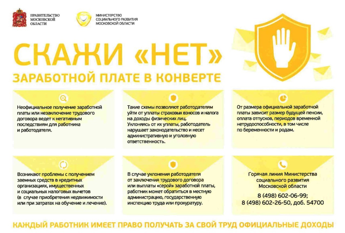 ❓Что теряет человек, получая серую зарплату 🔘такие схемы позволяют работодателям уйти от уплаты страховых взносов и налога на доходы физических лиц 🔘от размера официальной заработной платы зависит размер будущей пенсии, оплата отпусков, периодов временной нетрудоспособности, в том числе по беременности и родам 🔘возникают проблемы с получением заёмных средств в кредитных организациях, имущественных и социальных налоговых вычетов В случае уклонения работодателя от заключения трудового договора или выплаты «серой» заработной платы, работник может обратиться в местную администрацию, государственную инспекцию труда или прокуратуру. 📌 горячая линия Министерства социального развития Московской области: 8 (498) 602-06-99; 8 (498) 602-26-50, доб. 54700.