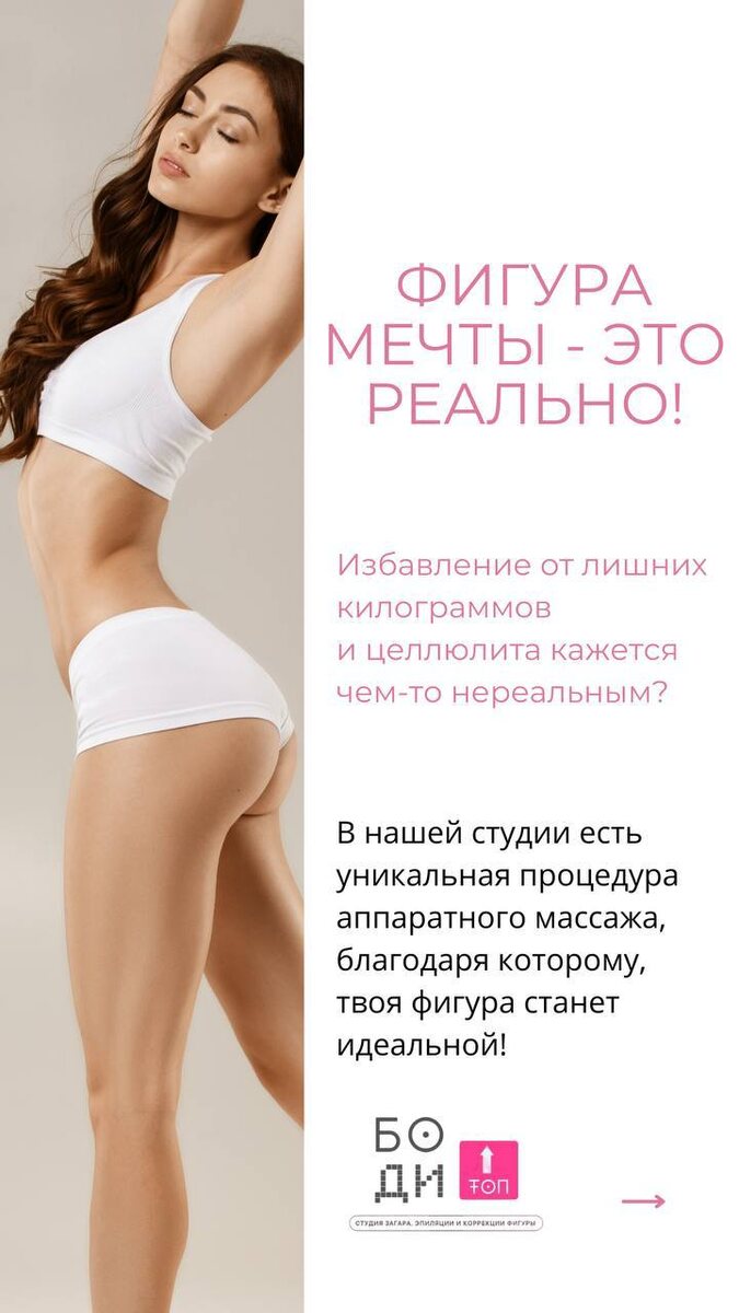 ФИГУРА МЕЧТЫ - ЭТО РЕАЛЬНО! Сбросить лишние килограммы и справиться с целлюлитом кажется вам недостижимой целью? В нашей студии мы предлагаем уникальную процедуру аппаратного массажа, которая поможет тебе достичь идеальной фигуры!🔥