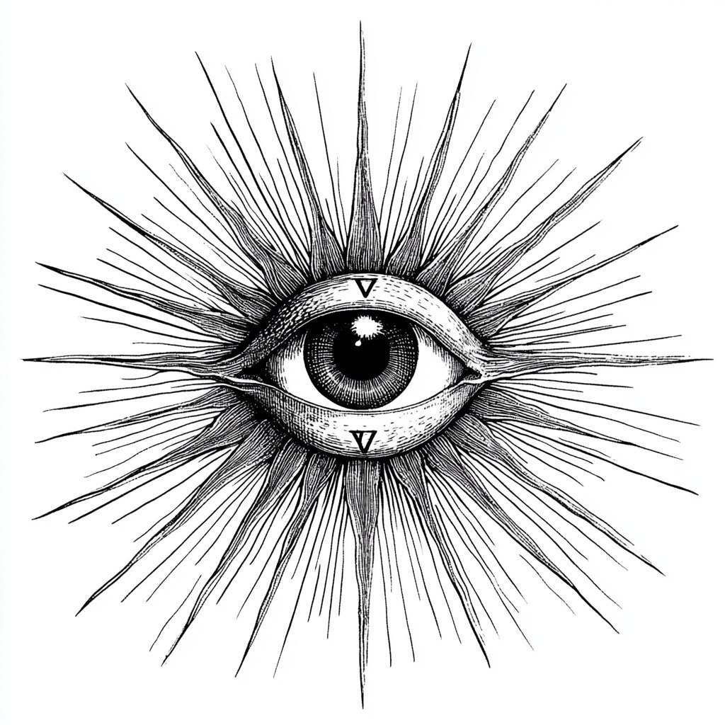 Создано на основе запроса: eye in the sun with a lot of rays, Mystical Tarot style in Dürer's graphics, thick lines, composition as on