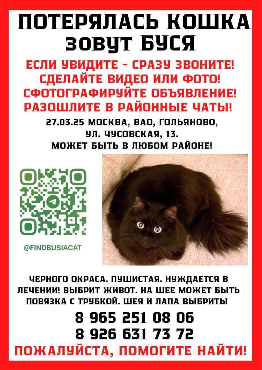 Друзья! Кошку Бусю пока не нашли! Но волонтеры не теряют надежду! Пожалуйста 🙏🏻 Сделайте репост! Москва! Убежала кошка Буся‼ Максимальный репост! Ваш репост спасет жизнь!🙏🏻‼ Раскидайте в группы района Гольяново и ближайших🙏🏻 Пристроенная кошка вырвалась у хозяйки! Ситуация крайне опасная для кошки! У нее стоит стома для кормления и бандаж на шее! Животное на лечении! Москва ! Гольяново. Чусовская 13. 27 Марта 2025 года в 20.30 вечера выбежала на улицу. Особенности: кошка после стационара, с бандажом на шее Просьба всем кто увидит срочно позвоните или напишите в вотсап, телаграм. +79159443740 +79266317372 Опубликуйте пожалуйста объявление в ваших соц сетях! Нужны люди для прочесывания района и расклейки объявлений! Счёт идет уже на часы! Группа поиска! 🚨 t.me/FindBusiaCat