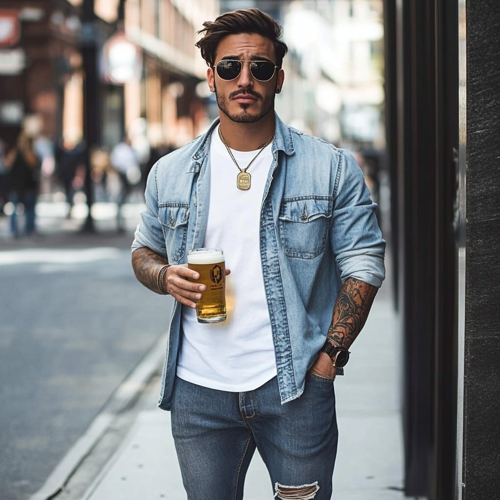 Создано на основе запроса: a cool skinny man, holding a BEER, without tattoos on the arms, Wearing an open long-sleeve denim shirt with a white t-shirt underneath, designer style