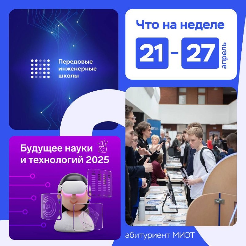 👋 Привет, абитуриент! НИУ МИЭТ регулярно проводит мероприятия, интересные школьникам разных возрастов. Делимся списком ближайших: 🔹 Будущее науки и технологий Продолжается прием проектных работ в рамках конкурса «Будущее науки и технологий». В пятницу 25 апреля в 16:00 состоится вебинар, посвященный секции «Умный город. Интернет вещей». Представитель жюри секции расскажет о том, какие работы допускаются на конкурс. Регистрация 🔸 Вебинары Приёмной комиссия МИЭТ Ближайший вебинар пройдет 22 апреля в 19:00 и будет посвящен теме «Целевая квота». Регистрация 🔹 Еженедельные экскурсии по направлениям подготовки Ближайшая экскурсия пройдет 25 апреля в 16:00 по направлениям подготовки среднего профессионального образования: 11.02.13 Твердотельная электроника (на базе 9 класса и 11 класса) 09.02.07 Информационные системы и программирование (на базе 9 класса и 11 класса) Регистрация 🔸 Школа проектирования ПИШ МИЭТ Бесплатный образовательный курс для школьников 8-10 классов, направленный