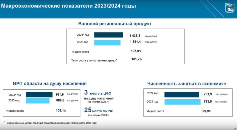 📈 Экономика Белгородской области показала рост в 2024 году В 2024 году валовой региональный продукт региона увеличился на 7% в текущих ценах, а в пересчете на душу населения рост составил 8%, сообщил в ходе оперсовещания правительства первый вице-губернатор Илья Пономарёв. Занятость населения осталась стабильной с минимальным снижением на 0,1%. Объем вложений в основной капитал достиг 236 млрд рублей, что на 3,1% больше показателей 2023 года. По этому показателю Белгородская область занимает 7-е место в ЦФО, а по инвестициям на душу населения - 6-е место с ростом 12,6%. В реализацию 38 крупных инвестиционных проектов было вложено 33 млрд рублей, создано около тысячи новых рабочих мест. Всего в инвестиционном портфеле региона насчитывается 139 перспективных проектов на сумму 466 млрд рублей. Подписаться на 🗞🗞 | Прислать новость