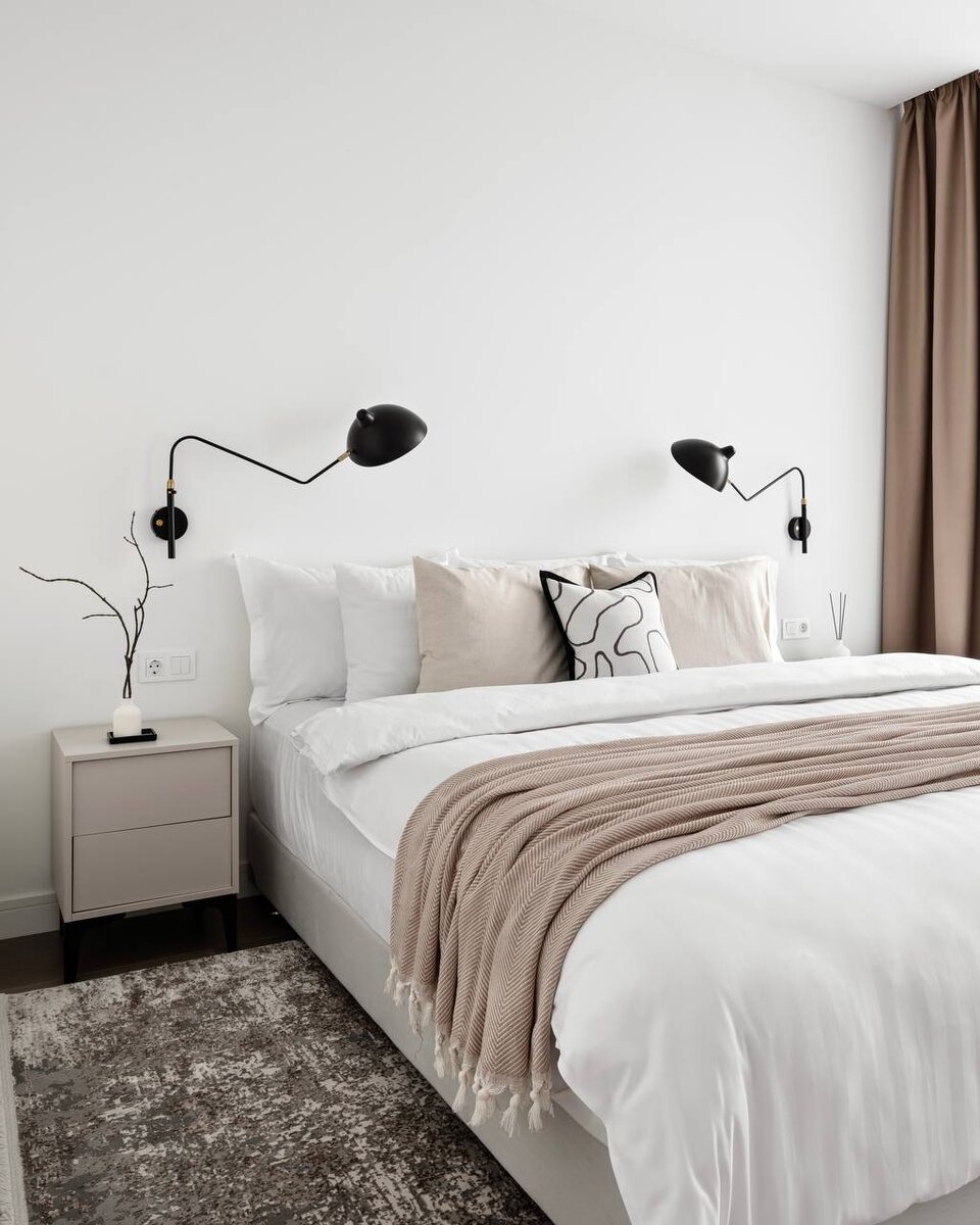 Современная спальня с тёплым характером Минимализм не обязан быть холодным — этот проект тому подтверждение. Белоснежная база, тактильный текстиль, песочные акценты и графичные чёрные детали создают ощущение спокойствия, уюта и сдержанной элегантности. Здесь продумано всё: от функциональных бра до выразительного пледа и декоративной подушки, которые добавляют индивидуальность в лаконичную композицию.