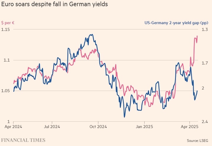 По словам Майка Ридделла, управляющего фондом облигаций в Fidelity International, корреляция между евро и относительными ставками «полностью нарушилась за последние две недели, поскольку и бунды, и евро выиграли от опасений на рынке, вызванных политикой США». Это «симптом оттока капитала», добавил он.