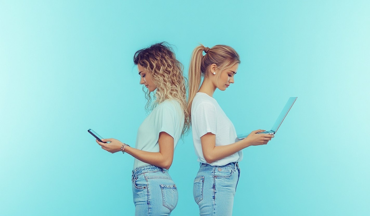 Создано на основе запроса: Two american women standing back to back, one holding an iPhone and the second typing on her laptop computer in