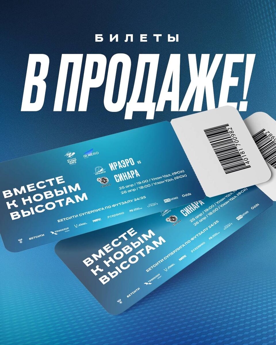 ⚽️ Впервые Улан-Удэ - Суперлига России по футзалу! 25-26 апреля в ФСК пройдет заключительный тур Суперлиги России. Площадка на два дня станет домом для иркутского футзального клуба «ИрАэро», который примет «Синару» из Екатеринбурга. «Авиаторы» готовы к битве! Поддержи команду на заключительном этапе сезона🔥 Отметим, 22 и 23 апреля в ФСК пройдут мастер-классы для детей с 14:00 до 15:00. 24 апреля - предыгровая тренировка у «ИрАэро» с 16:00 до 17:30, у «Синары» с 17:30 до 18:30. В этот же день пройдет совместная автограф-сессия с 19:00 до 20:00. Купить билеты: 25 апреля в 19:00 -https://irkutsk.qtickets.events/160315-iraero-sinara 26 апреля в 18:00 -https://irkutsk.qtickets.events/160414-iraero-sinara Реклама.Рекламодатель АНО "ФК "ИрАэро".ИНН:3808278027.erid:2SDnjcZkQPw.