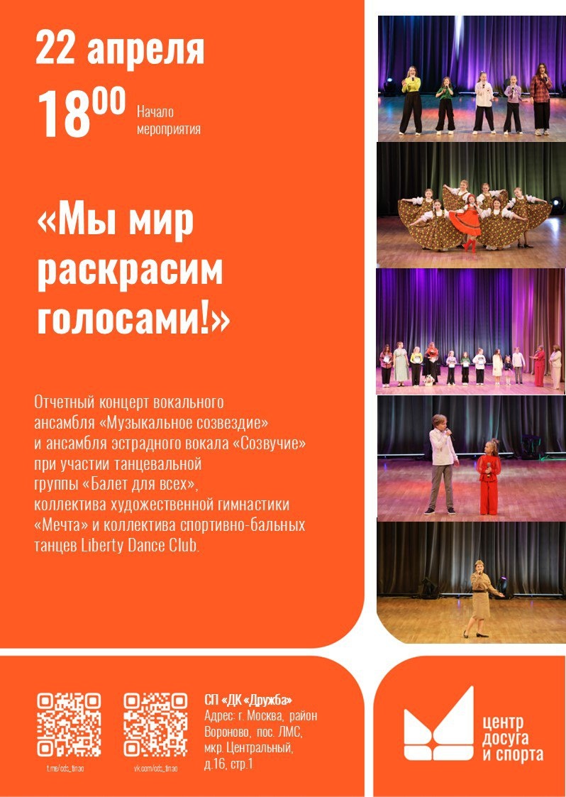 🎤 "Мы мир раскрасим голосами!" 🎤 Завтра приглашаем на отчётный концерт вокальных ансамблей "Музыкальное созвездие" и "Созвучие"! 🎶 Вас ждут яркие выступления вокалистов, танцевальной группы "Балет для всех", коллектива художественной гимнастики "Мечта" и коллектива спортивно-бальных танцев Liberty Dance Club! 22 апреля в 18:00 в ДК "Дружба"! #Концерт #Вокал #Танец #Гимнастика #ДКДружба #МыМирРаскрасимГолосами