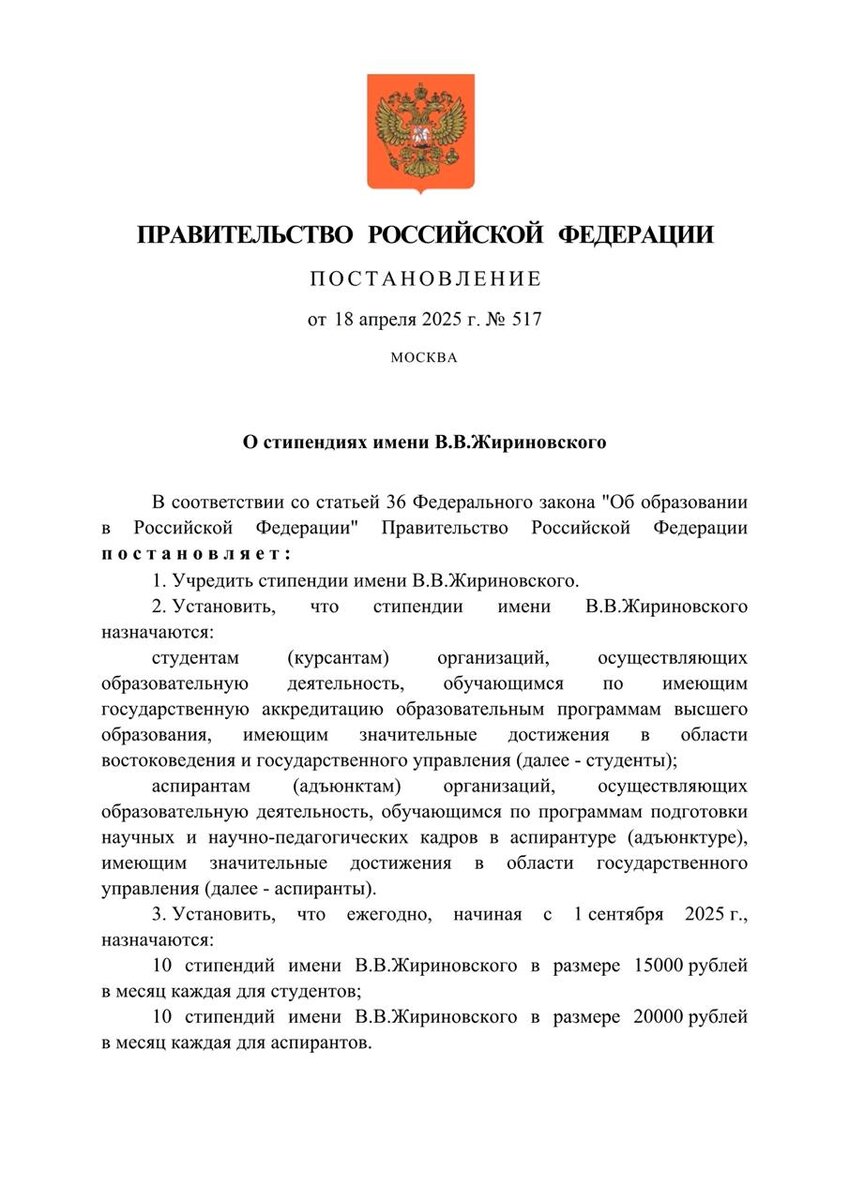 ❗️Именем Жириновского. Правительство утвердило стипендии им. В.В. Жириновского, а также Правила назначения и выплаты.