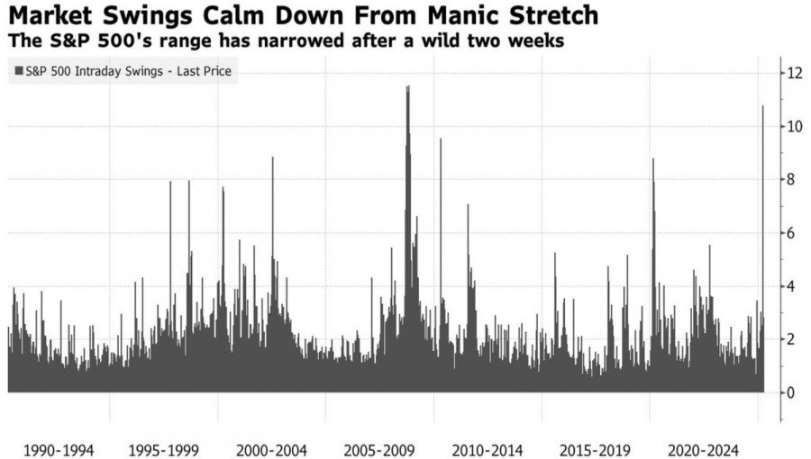 https://basechop.ru/wordpress/?p=39322 После диких колебаний первой декады апреля рынок акций США как будто поставили на паузу. S&P 500 ни жив, ни мертв и напоминает кота Шредингера. Случись какое-либо из ряда вон выходящее событие – и широкий фондовый индекс вернется на территорию «медведей». А спровоцировать это событие одним сообщением в социальных сетях способен Дональд Трамп. Это парень, от слова которого зависят триллионы долларов. Такого еще не было в истории корпоративной Америки. Стоит ли удивляться повышенной волатильности? Динамика изменчивости котировок S&P 500 На самом деле понятно, почему S&P 500 рухнул и застыл на месте в ожидании будущих указаний хозяина Белого дома. Республиканец впечатлил инвесторов заявлением о переходе от краткосрочной боли к долгосрочному процветанию США. Однако как далеко готов пойти Дональд Трамп, не знает никто. Не обернется ли краткосрочная боль рецессией в американской экономике? Или переговоры Вашингтона с другими странами закончатся отмено