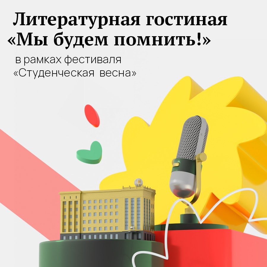 В этот четверг, 24 апреля, в холле Головного Управления Челябинвестбанка на пл.Революции, 8 пройдет литературная гостиная «Мы будем помнить!». Главная тема - 80-летие победы в Великой отечественной войне. В программе — лучшие выступления участников Студенческой весны в номинации «Художественное слово». В этом году стать зрителем можно будет онлайн: официальное сообщество Студенческой весны будет вести онлайн-трансляцию. Начало в 14:00.