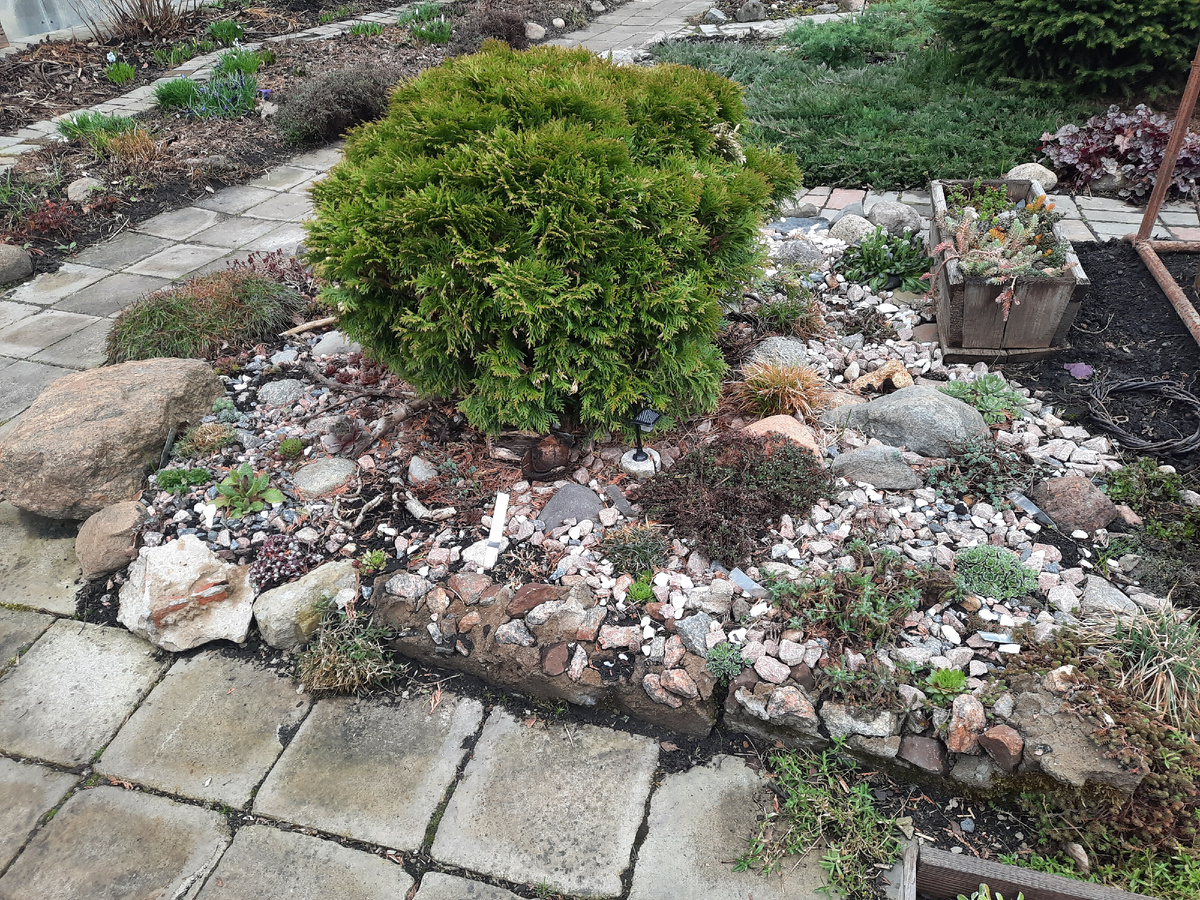 Армерия с белыми цветочками в этом месте отлично перезимовала, много лучше, чем ее сестрицы около арки. Камешки помогли? Или отсутствие соседей? Вопрос на будущее наблюдение.