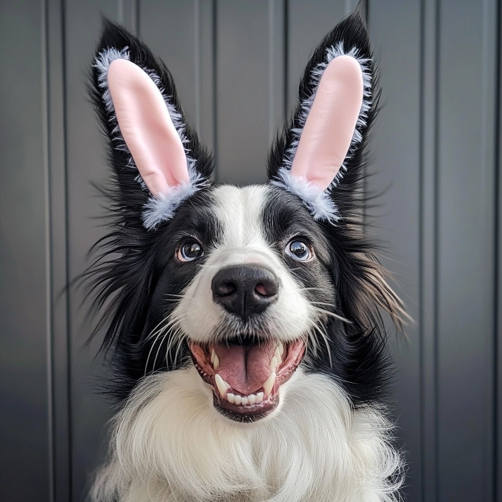 Создано на основе запроса: crustacean black and white bordercollie with rabbit ears making funny faces.
