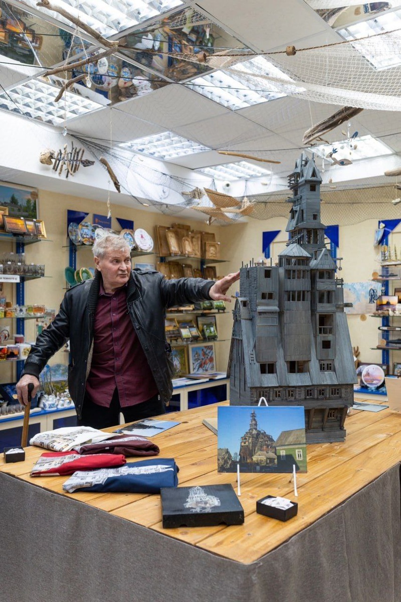 Этот дом создал народный мастер Анатолий Галушин, выполнен в масштабе 1:32 с мельчайшей детализацией. Мастер использовал традиционные породы дерева – сосна и ель, что позволило максимально точно передать фактуру оригинального строения.