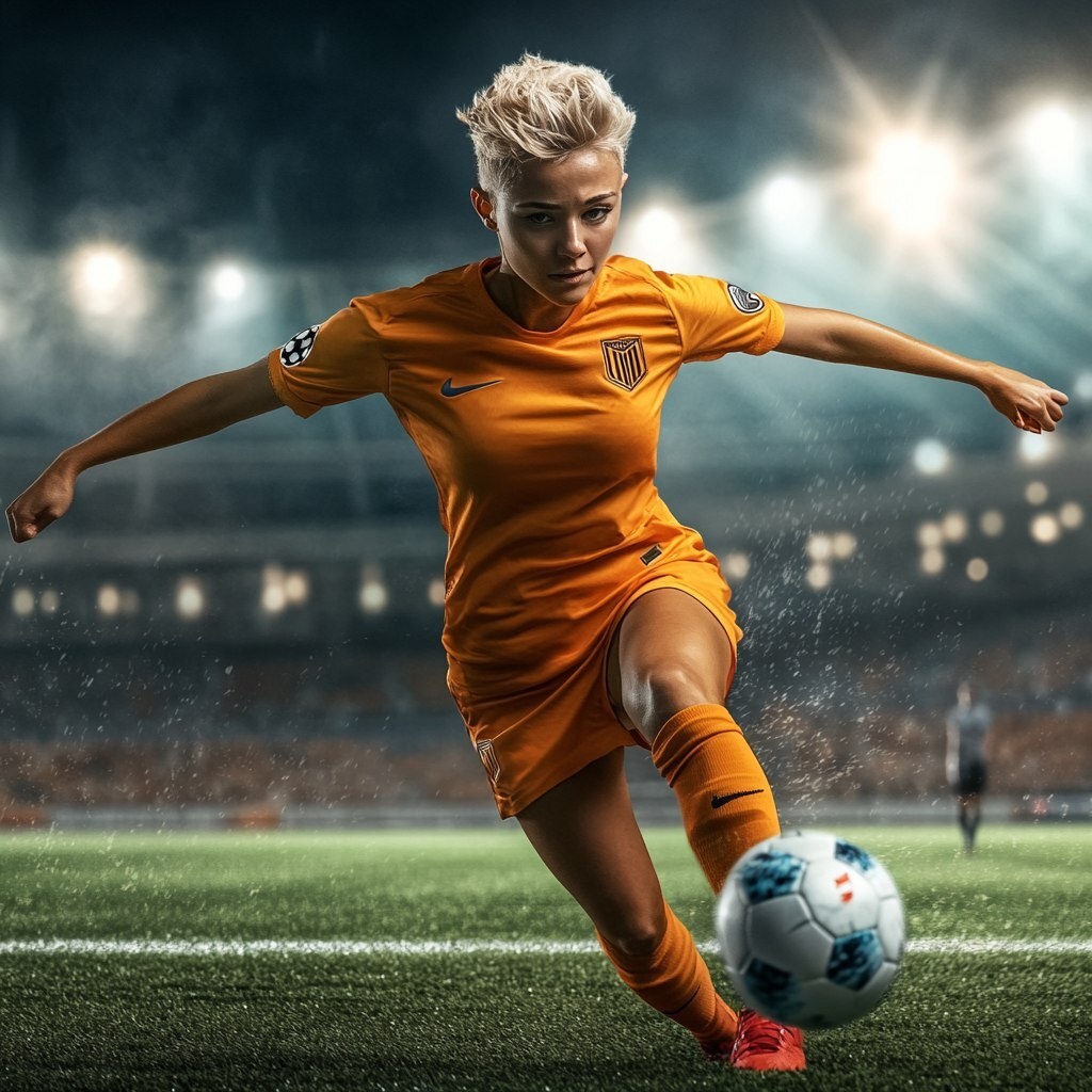 Создано на основе запроса: A determined short-haired female soccer player, captured in a half-body shot from a side profile, kicking the ball with full effort while looking directly at the camera, wearing an orange team jersey, dynamic posture, her short hair moving with the action, with the soccer field and blurred stadium lights in the background, realistic lighting, cinematic sports photography style.