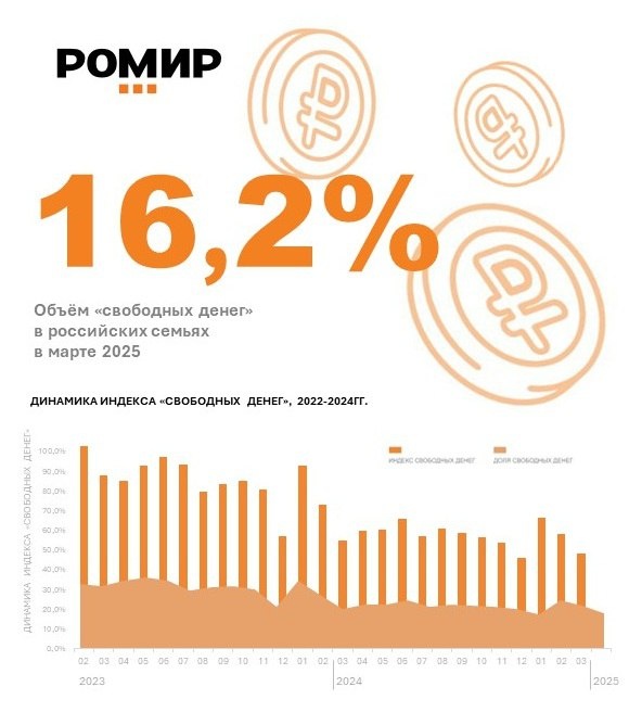 В ответ на пост 16,2% составила доля «свободных денег» в бюджете среднестатистической российской семьи в марте 2025 года, что на 3.3 п.п. ниже, чем в феврале. Индекс свободных денег (ИСД) достиг значения 47,9%, уменьшившись на 9.9 п.п. по сравнению с предыдущим месяцем. Относительно марта прошлого года ИСД снизился на 6.7 п.п. 🔸Сохранение высокой ключевой ставки Центробанком РФ: поддержание высокой ключевой ставки может повлечь за собой увеличение платежей по ипотечным и другим кредитам, что приводит к сокращению свободных денежных средств. 🔸Активные закупки товаров для дачного сезона: предвещая наступление дачного сезона, россияне могут активно расходовать свои сбережения на приобретение необходимой утвари и других товаров, связанных с дачным сезоном. 🔸Планирование летних отпусков: летний сезон, как правило, ассоциируется с планированием отпусков и поездками. В марте этот процесс активно начинается, что может привести к сокращению объёма «свободных денег» в бюджете россиян. #ин