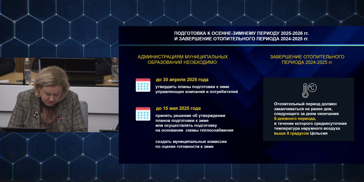 Это города Уфа, Агидель, Стерлитамак и Сибай, а также Благовещенский, Ишимбайский, Мелеузовский, Ермекеевский и Миякинский районы. Еще десять муниципалитетов планируют завершить отопительный период на текущей неделе, сообщила министр ЖКХ РБ Ирина Голованова на оперативном совещании в правительстве. В соответствии с новыми правилами отопительный период завершается, если в течение пяти дней сохраняется температура выше 8+ градусов. «Однако с учетом прошлогоднего опыта и в связи с прогнозом погоды на майские праздники (ожидается понижение температуры и дожди) муниципалитетам предложено при отключении отопления не отключать насосы, не начинать гидравлические испытания и оставить систему под давлением, чтобы при необходимости можно было возобновить подачу тепла», – подчеркнула министр. Скриншот видео оперативного совещания в правительстве РБ.