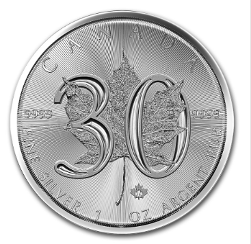 Монета 5 долларов. 30 лет Кленовому листу. Ag 31.1