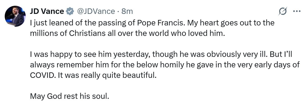 В ответ на пост ‘My heart goes out to the millions of Christians all over the world who loved him.’ JD Vance — one of last people to see Pope Francis alive — hails his ‘beautiful’ below homily near start of COVID #JDVance #Pope
