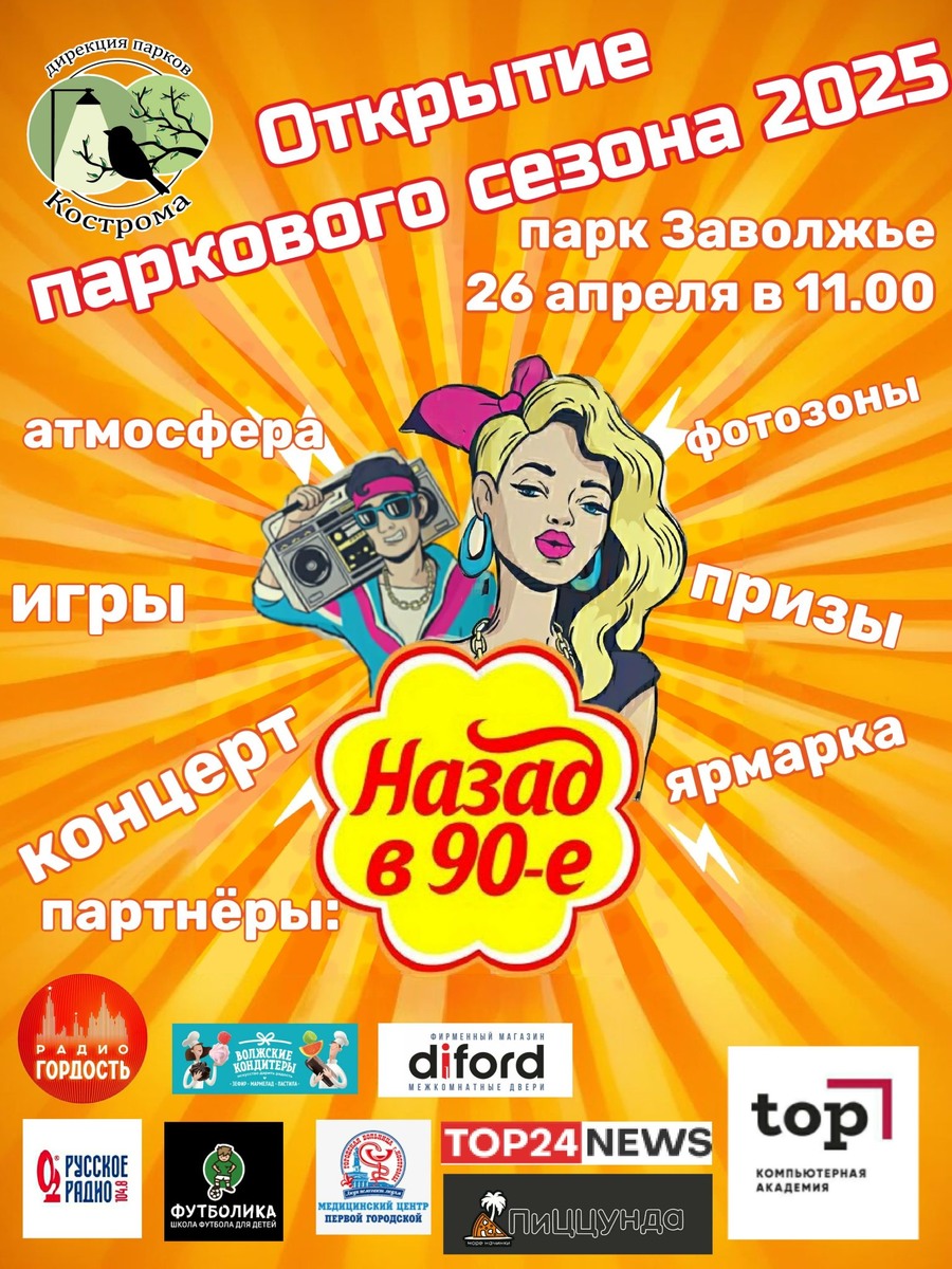 В Костроме открытие паркового сезона 2025 года состоится 26 апреля. Дирекция парков города обещает погрузить гостей в атмосферу 90-х и приглашает всех желающих посетить необычное мероприятие. «Девяностые — это целая вселенная, особый взгляд на мир и состояние души! Приглашаем вас с нами в это путешествие во времени», — обратились к костромичам представители Дирекции парков. По словам организаторов, на празднике будет не только весело, но и вкусно. А самые активные получат шанс выиграть призы от партнеров мероприятия. Подарок получит также тот, кто придет в в самом ярком и запоминающемся наряде в стиле 90-х. Генеральный партнер мероприятия — Компьютерная академия ТОП в Костроме. Среди других партнеров: фирменный магазин Костромской фабрики дверей «DIFORD», школа футбола для детей «Футболика», Медицинский центр Первой городской больницы, пиццерия Пиццунда, фабрика «Волжские кондитеры». Открытие сезона состоится в парке Заволжье 26 апреля в 11:00.