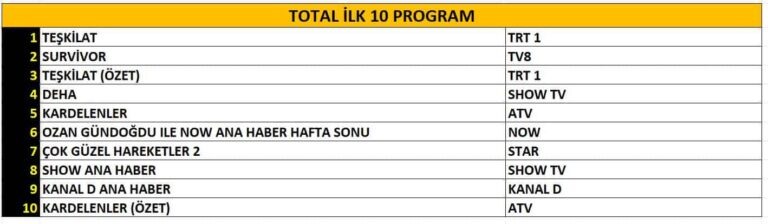 📺 TRT1 снова доказал, что его сериал — настоящий магнит для зрителей. “Teşkilat” уверенно занял первое место, оставив позади даже накал страстей в “Survivor 2025 All Star – Gönüllüler” на TV8. А третью строчку неожиданно взял… повтор “Teşkilat”! Да-да, даже повторный показ собрал больше зрителей, чем многие свежие проекты. 💡 **AB-аудитория: интеллектуалы выбирают “Deha”**