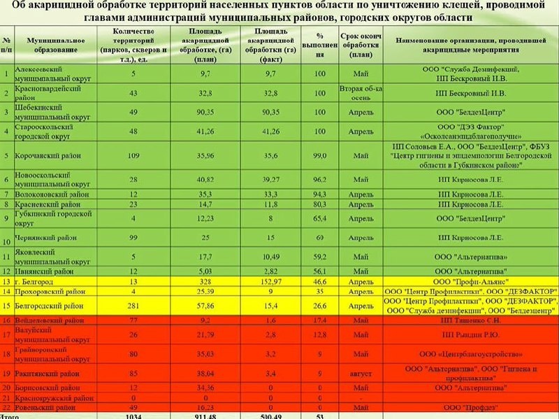 Четыре района области полностью выполнили дезинсекцию. Из-за сложной оперативной обстановки Грайворонский округ, Ракитянский, Борисовский районы такую работу почти не проводили. При этом в Краснояружском районе обработку проводить не будут совсем.
