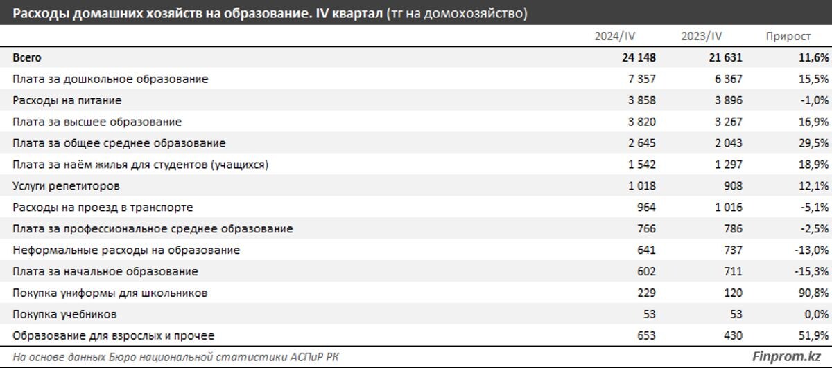 В четвёртом квартале 2024 года казахстанские семьи, судя по официальным данным, потратили на образование в среднем 24,1 тыс. тенге — на 11,6% больше по сравнению с аналогичным периодом 2023 года. При этом расходы горожан в секторе в среднем составили 27,6 тыс. тенге в квартал на одно домохозяйство, тогда как расходы сельских жителей — лишь 16,6 тыс. тенге. Разница между ними достигла 39,8%, или 11 тыс. тенге, пишет finprom.kz. Наибольшая статья трат пришлась на оплату дошкольного образования: 7,4 тыс. тенге на семью в квартал в среднем по стране — на 15,5% больше, чем годом ранее. Далее следуют расходы на питание учащихся (3,9 тыс. тенге) и оплата высшего образования (3,8 тыс. тенге). В пятёрку самых затратных направлений также вошли оплата общего среднего образования (2,6 тыс. тенге) и аренда жилья для студентов (1,5 тыс. тенге). Дополнительно семьи в среднем тратили 1 тыс. тенге на репетиторов, 964 тенге на проезд, 766 тенге на профессиональное среднее образование, 641 тенге на разны