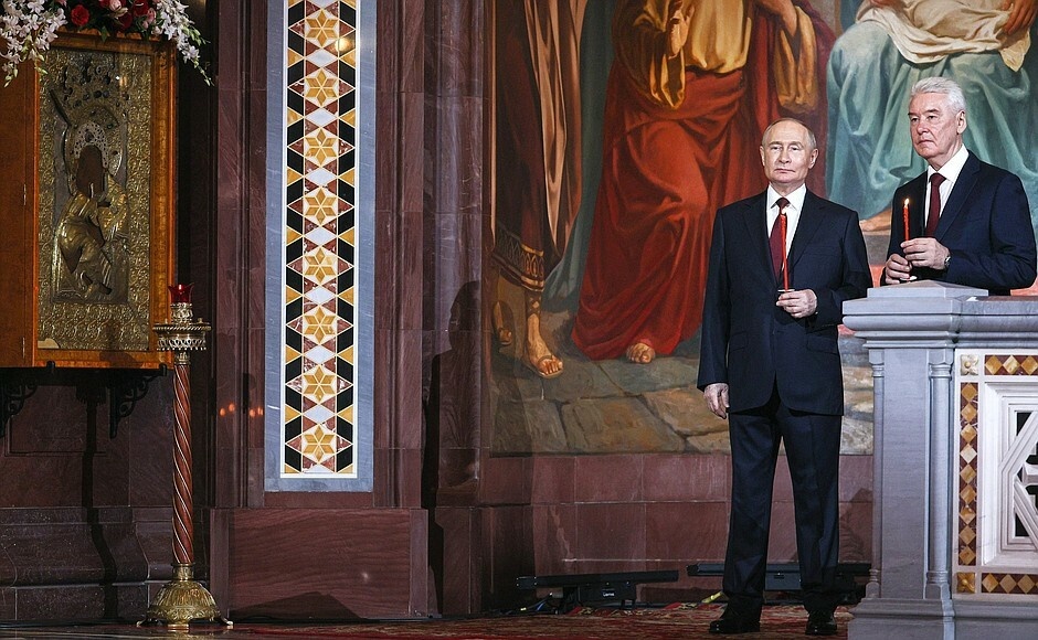 Владимир Путин вместе с мэром Москвы Сергеем Собяниным присутствовал на ночном пасхальном богослужении в храме Христа Спасителя. Службу совершил Патриарх Московский и всея Руси Кирилл.