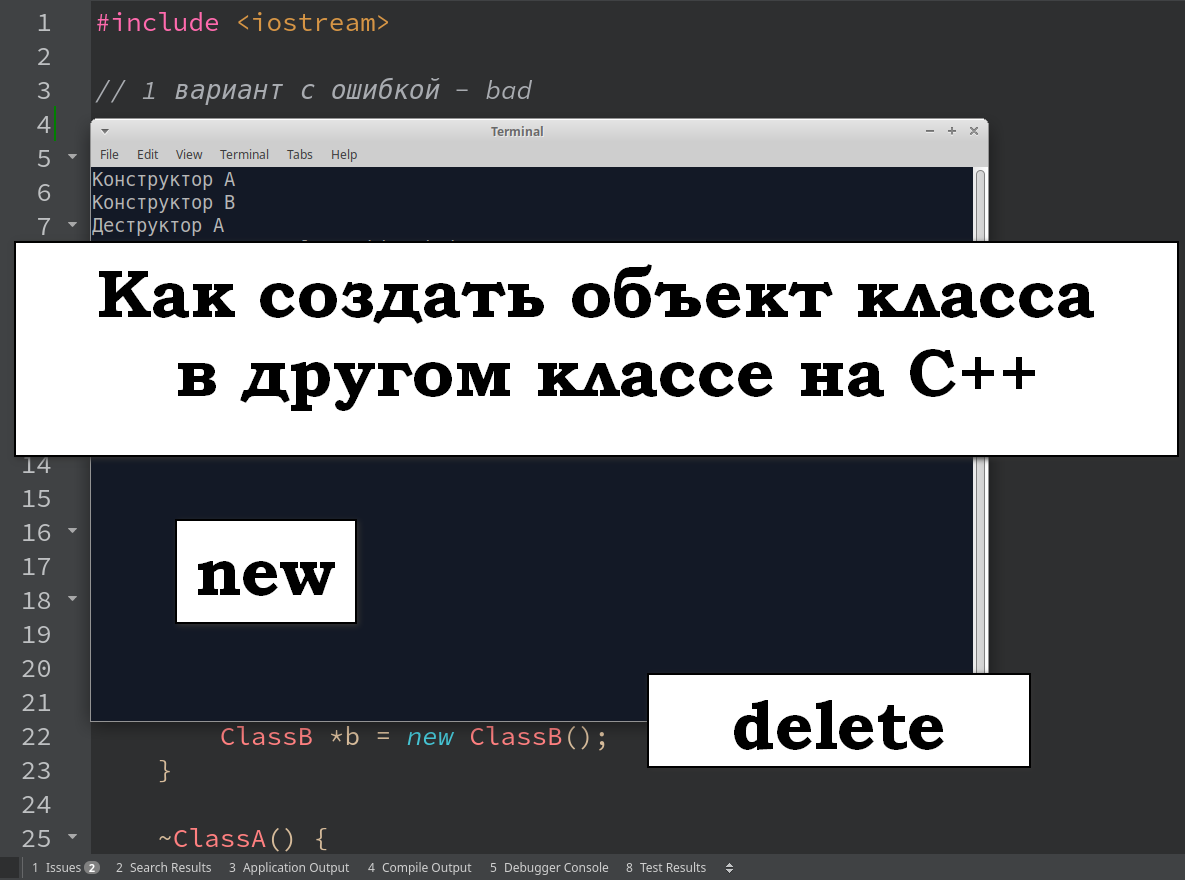 Этот материал является частью моих занятий по программированию с теми, кто только начинает свой путь в программировании на C++ и Qt/Qml. Не является полным и исчерпывающим гайдом. В языке программирования C++ создание объектов классов — это очень частая история, как вы понимаете. И есть один нюанс, который очень часто молодые специалисты оставляют без внимания: это удаление объектов. Допустим у нас есть класс А. В нем мы хотим создать объект другого класса (например B). Что мы получим в терминале после запуска программы: В этой программе существует один большой косяк - отсутствует удаление объекта b. Что приведет к утечке памяти, а потом и к падению программы. В C++ за динамическое выделение памяти отвечает `new`. Внимание! Проект не соберется! это только демонстрация другой ошибки. Исправим ошибку так, как вы могли бы предложить. И часто предлагаете. Добавим конструкцию с `if()` и `delete` в деструктор. И это правильный подход. Получили ошибку: ============================ In destr
