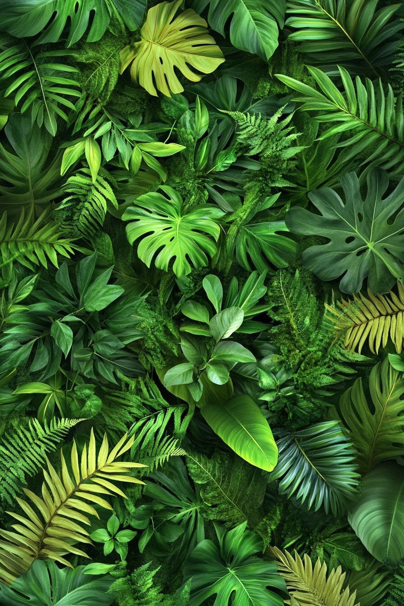 Создано на основе запроса: hyper-realistic texture vertical garden with different types of tropical leaves, with richer green tones with