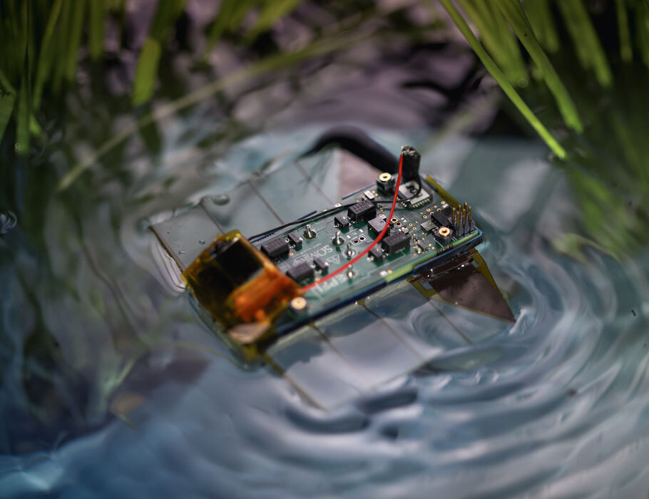 Навигация и исследование поверхности водоемов позволяют автономным плавательным роботам выполнять широкий спектр задач: от сбора данных до обмена информацией и получения энергии от солнечных источников. Однако подобная среда зачастую отличается высокой степенью неструктурированности из-за водной растительности и различного мусора. Это требует от роботов высокой маневренности и способности к быстрому передвижению. Этот компактный, маневренный и полностью автономный робот сантиметрового масштаба, способный перемещаться со скоростью до 5,1 см/с и поворачиваться со скоростью до 195 градусов в секунду. Движение осуществляется с помощью пары мягких грудных плавников толщиной в миллиметр. Бегущие волны на этих плавниках возбуждаются электрическими колебаниями, что обеспечивает эффективное и устойчивое перемещение. Привод, конструкция робота и источник питания были разработаны как единая система с целью достижения высокой эффективности в компактном формате. Каждый боковой привод представляет с