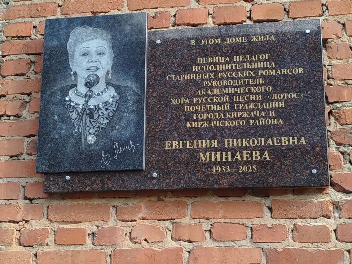 18 апреля в городе Киржач была установлена мемориальная доска Почетному гражданину Киржачского района, певице, педагогу и хормейстеру Евгении Николаевне Минаевой. С инициативой об установке выступил депутат города Киржач Пётр Генин и участники академического хора русской песни «Лотос», руководителем которого была Евгения Минаева. Доску установили на фасаде многоквартирного дома № 12 по ул. Садовая города Киржач, где в последние годы жизни жила певица. Евгения Николаевна Минаева ушла из жизни в январе текущего года, немного недожив до своего 92 дня рождения. Всю свою жизнь она посвятила культуре, искусству и образованию в Киржачском районе. Детство Евгении пришлось на суровые военные годы. От отца она унаследовала идеальный слух и любовь к музыке и пению. На сцену выходила в качестве солистки еще в школьные годы и радовала жителей Киржача своим высоким чистым голосом. Минаева прошла конкурсный отбор и стала участницей студенческого хора Московской консерватории им. В.И. Чайковс