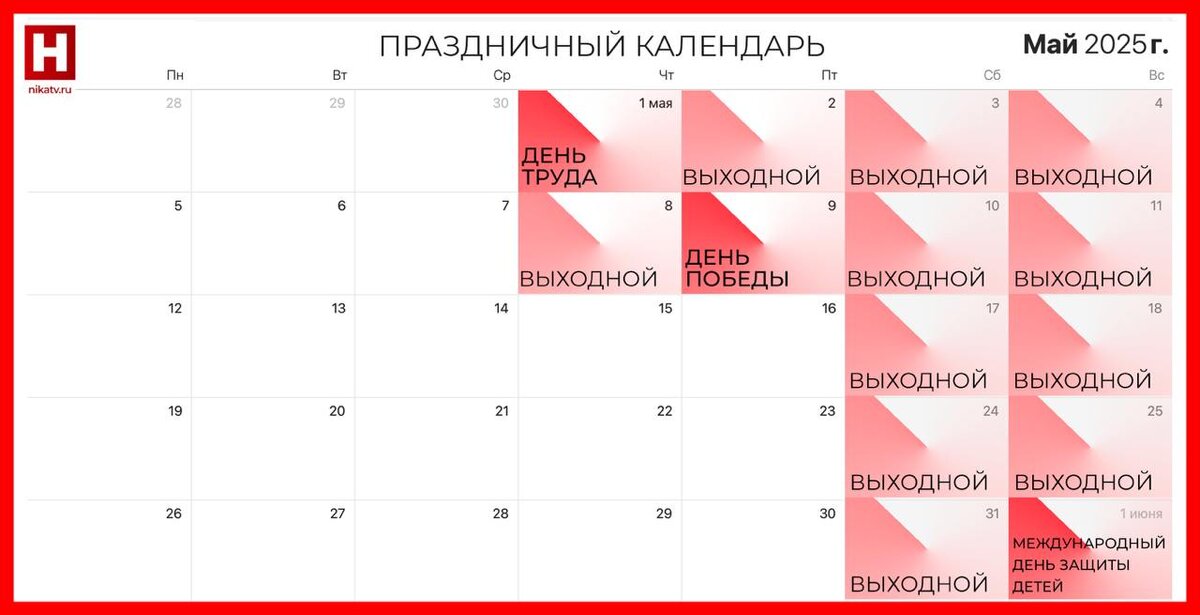 🏖 Отдыхать на майские будем долго! Впереди нас ждут День Труда, День Победы, и не за горами — Международный день защиты детей. 🧮 Следующий месяц начнётся с четырёх выходных, затем — три рабочих дня, и снова четыре выходных. В мае получается целых 13 дней отдыха. С такими праздниками можно устроить себе мини-отпуск. 🤖 Прислать новость 📺 Заказать рекламу