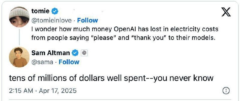 Вы когда-нибудь задумывались, что простое "спасибо" в диалоге с ChatGPT обходится компании OpenAI в десятки миллионов долларов? 🤑 Сэм Альтман, CEO OpenAI, признал: каждый вежливый ответ нейросети требует огромных вычислительных ресурсов — серверы, электричество, вода для охлаждения...