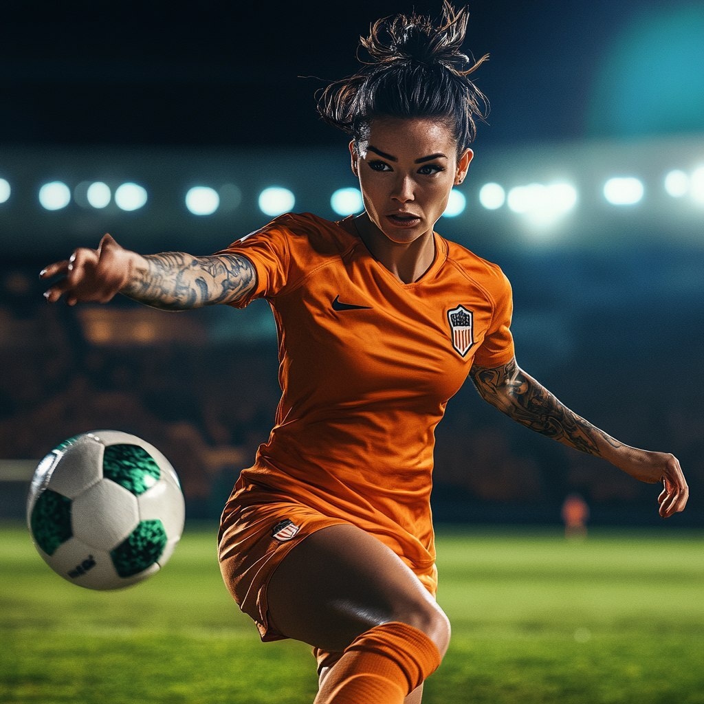 Создано на основе запроса: A determined short-haired female soccer player with black-brown hair, captured in a half-body shot from a side profile, kicking the ball with full effort while looking directly at the camera, wearing an orange team jersey, dynamic posture, her hair moving with the action, with the soccer field and blurred stadium lights in the background, realistic lighting, cinematic sports photography style. --- Автоперевод: Определенный футболист с короткими волосами с черно-коричневыми волосами, запечатленные в снимке с половиной тела из бокового профиля, с полными усилиями, смотрящей прямо на камеру, одетый в апельсиновую командную майку, динамичную позу, ее волосы, движущиеся с действием, с футбольным полем и размытыми огнями стадиона на фоне, реалистичного освещения, кинематографического спортивного стиля. Интересно выглядит? 🤔 https://dzen.ru/id/65c0c65c86e4f837c27b24d7 #ИИ #AI #нейросеть #midjourney #art