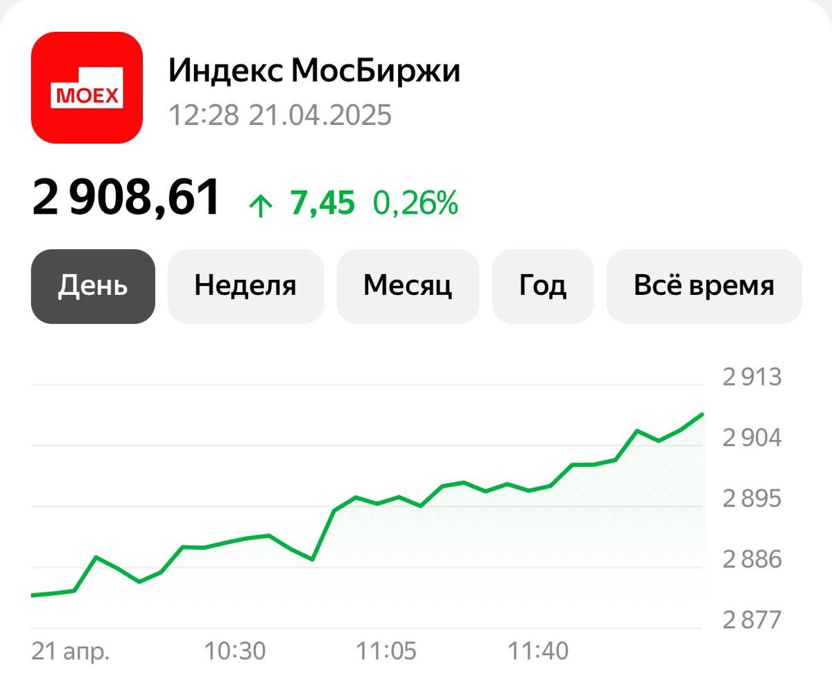 Мирная сделка на следующей неделе?🤔 👍Индекс Мосбиржи в понедельник на уровне 2908 пунктов. Постепенно закрепляемся выше 2900. 💲Курс доллара (по данным ЦБ) - 81,1 рубль ❗️На межбанке американская валюта упала до 79 рублей. Ждём снова по 30?🤣 🗞️Золото - 3400 долларов за тройскую унцию. Новый исторический рекорд! Актив-убежище продолжает набирать обороты. Главная причина роста его популярности - торговая война США и Китая. 🗞️В Россию может снова прилететь спецпосланник президента США Стив Уиткофф. По данным американских журналистов, это произойдет после встречи делегаций США, Украины и Европы в Лондоне уже в конце этой недели. Это может стать четвертым визитом Уиткоффа в Россию. 👉🏻Между тем, Трамп надеется на мирную сделку между Россией и Украиной уже на следующей неделе. Надежды появляются так часто, что в них инвесторы уже мало верят. А у вас остаются надежды на завершение конфликта в 2025 году?⬇️
