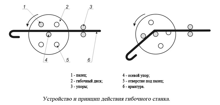 Принцип работы: Гибочный диск вращается вручную, а рычаг создает усилие для изгиба прутка.