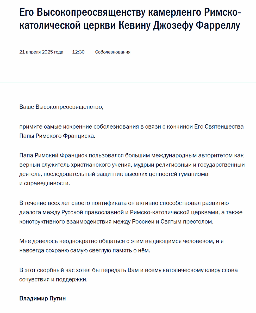 ️"Папа Римский Франциск ползовался большим международным авторитетом как верный служитель христианского учения, мудрый религиозный и государственный деятель, последовательный защитник высоких ценностей гуманизма и справедливости. В течение всех лет своего понтификата он активно способствовал развитию диалога между Русской православной и Римско-католической церквами, а также конструктивного взаимодействия между Россией и Святым престолом", - отметил российский лидер. Российский президент вспомнил, как неоднократно общался "с этим выдающимся человеком", и подчеркнул, что навсегда сохранит "самую светлую память о нем".
