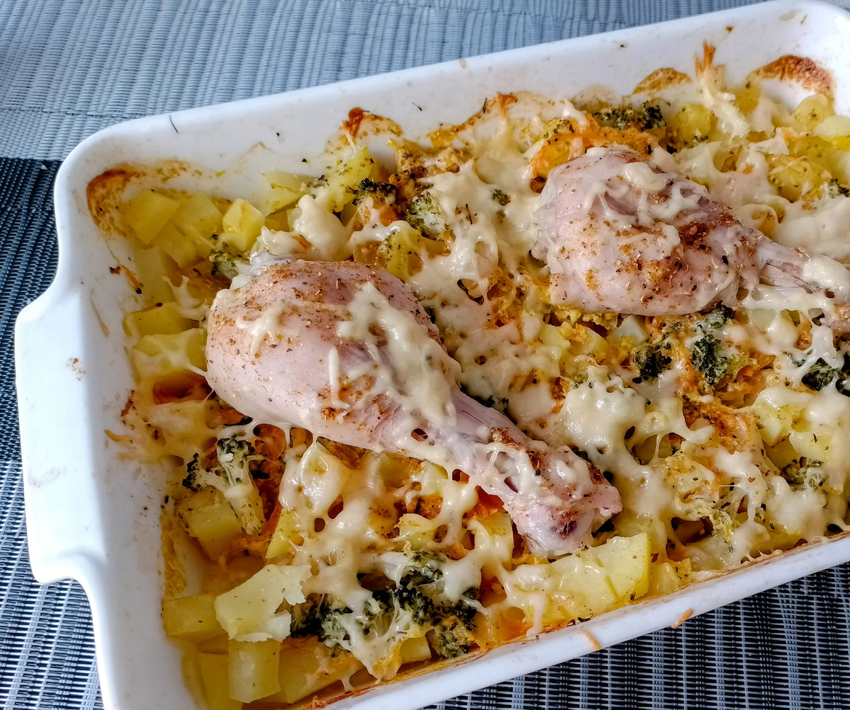👉 Подготовленные овощи соединяю вместе, добавляю соль, сметану, приправы и выкладываю в форму для запекания. Голени также присаливаю, приправляю и выкладываю поверх овощей. Запекаю в духовке под фольгой 35-40 минут. Но лучше ориентироваться на свою духовку. Возможно времени понадобится меньше.