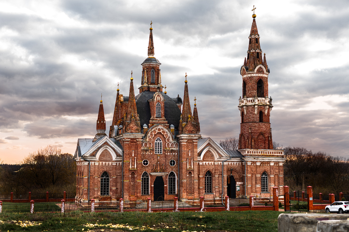 На этот раз наш путь лежит в Липецкую область, село Вешаловка. Где расположена необычная церковь с архитектурой псевдоготики. Церковь была заложена в 1768 году гвардии ротмистром Яковым Афонасьевичем Татищевым, сыном любимого денщика Петра 1. Упоминается две даты завершения строительства: 1 784 год, но настоящей датой считается 1794 год. Есть предположения, что столь долгое строительство связано с причастностью Татищевых к масонам. Архитектором церкви, предположительно был молодой, перспективный Василий Иванович Баженов, который тоже был причастен к масонам, хотя на момент строительства он еще не входил в движение масонов. Да и точно не известно, приложил ли он руку к данному строению. По мнению историков, на церкви есть символы масонов. Главный купол церкви венчает строение пятью островерхими шпилями. Вытянутые окна белыми рамами да и вся окантовка белого цвета на фоне красного кирпича придаёт церкви интересный вид. Говорят, что изначально колокольня была отдельно от церкви. Рядом