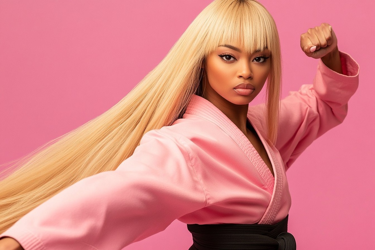 Создано на основе запроса: a beautiful mixed race woman with straight long blonde hair. with a blunt fringe. She is wearing a pink kimono with a black belt. She is doing karate kicks. pink dojo background. --- Автоперевод: Красивая смешанная женщина с прямыми длинными светлыми волосами. Как тебе эта картинка? 🤔 https://dzen.ru/id/65c0c65c86e4f837c27b24d7 #ИИ #AI #нейросеть #midjourney #art