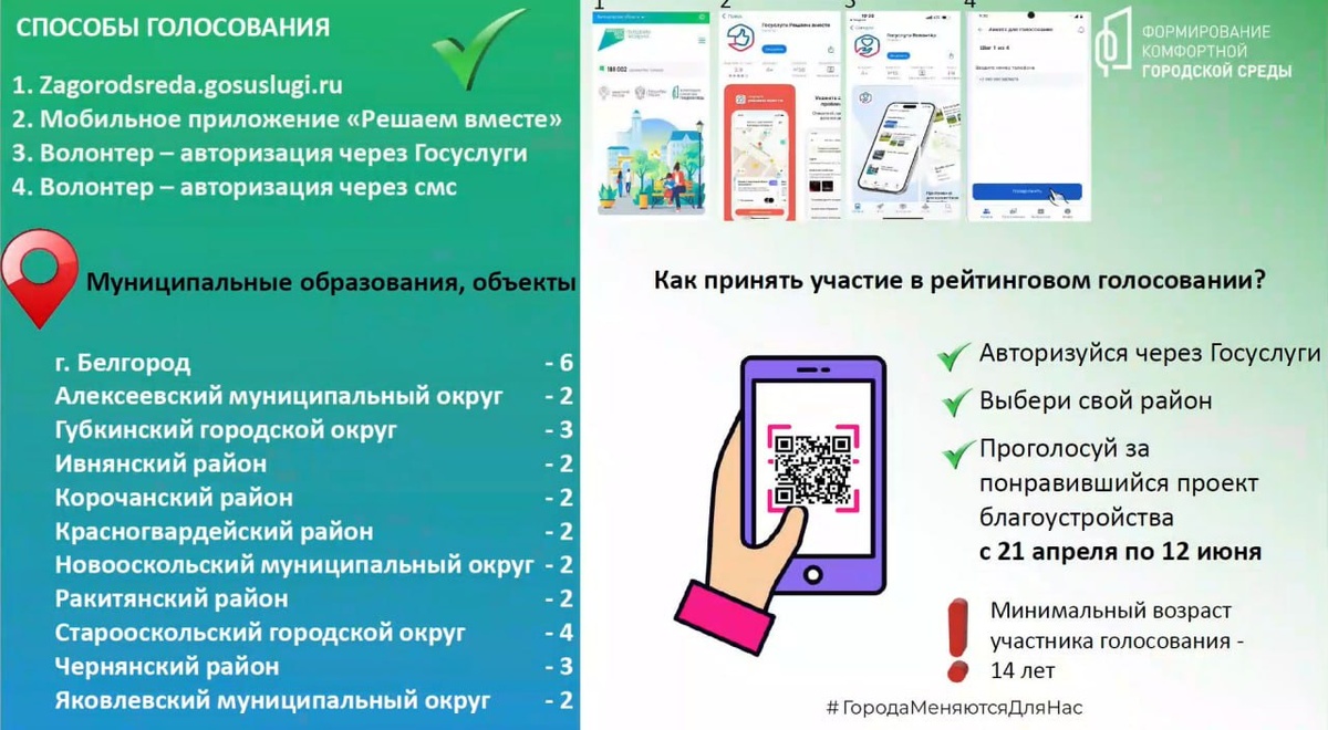 Ваш голос – ваш город! 🏙 ❗️ Стартовало голосование за лучший дизайн-проект общественных территорий В рамках всероссийского проекта белгородцы могут поддержать 30 территорий в 11 муниципалитетах региона. Отдать свой голос за дизайн-проект по благоустройству, который будет реализован в 2026 году, сможет каждый житель от 14 лет. Голосование продлится до 12 июня 2025 года. Поучаствовать в голосовании можно через платформу zagorodsreda.gosuslugi.ru и мобильное приложение «Госуслуги Решаем вместе». Отметим, что голосование проходит в рамках федерального проекта «Формирование комфортной городской среды» нацпроекта «Инфраструктура для жизни». Подписаться на нас|Предложить новость