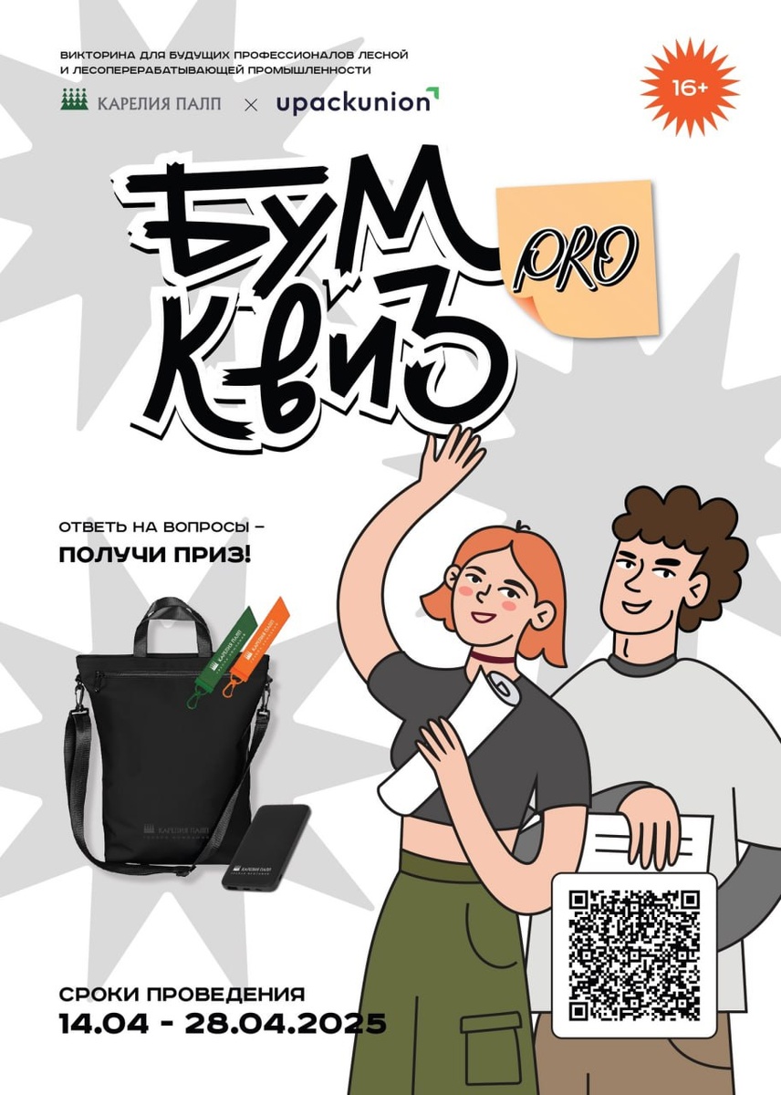 Дорогие студенты ⚡️ Приглашаем вас проверить свои знания о целлюлозно-бумажной промышленности! ✅ Медиасервис UpackUnion и компания «Карелия Палп» приглашают студентов средних и высших учебных заведений принять участие в онлайн-викторине, посвященной ЦБП и лесопромышленному комплексу. Проходи викторину по ссылке ⬅️ 🎁 Сюрприз для активных участников! Те, кто пройдет квиз под номерами 10, 30 и 50, получат эксклюзивный мерч от «Карелия Палп». Подробнее о конкурсе можно узнать здесь 👈