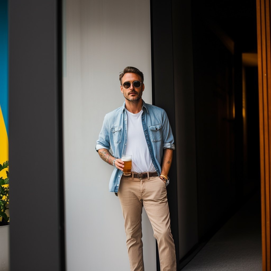 Создано на основе запроса: a cool skinny man, holding a BEER, without tattoos on the arms, Wearing an open long-sleeve denim shirt with a