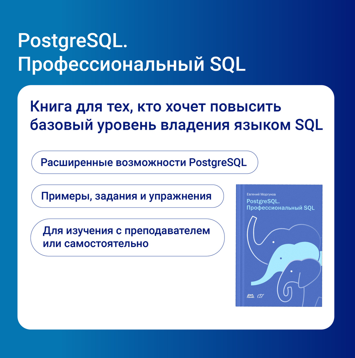 «PostgreSQL. Профессиональный SQL» поможет освоить язык SQL на профессиональном уровне для тех, кто стремиться знать больше и решать самые сложные задачи. Автор издания — Евгений Моргунов, преподаватель СибГУ им. М.Ф. Решетнева, специалист по разработке образовательных программ Postgres Professional. В книге накоплены знания, полученные за годы работы с СУБД — Евгений работает с PostgreSQL более 25 лет! Материал актуальный и построен на PostgreSQL 17. Подробности о книге собрали в карточках, издание доступно на нашем сайте.