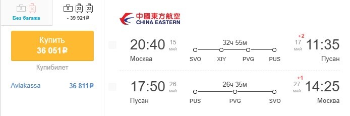 ✈️Москва - Пусан (Южная Корея), есть пересадки, туда и обратно, с багажом за 36050 рублей