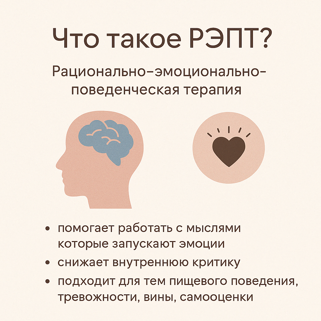 Для меня как для специалиста, совмещающего психологию и нутрициологию, РЭПТ становится мощным инструментом: ведь речь часто не про еду, а про отношения с собой, телом, эмоциями и жизнью в целом.