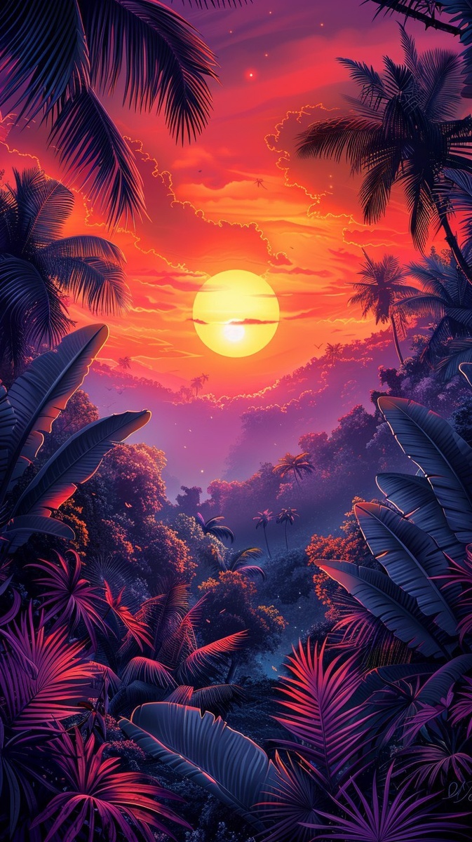 Создано на основе запроса: A digital illustration of tropical jungle leaves, large banana and monstera leaves in bold purples and blues, layered in the foreground, with a glowing orange and red sunset gradient background. Sunlight filtering through leaves creating vibrant contrast. Created Using: Procreate brushes, neo-tropical art style, vector layering, rich gradient overlays, digital airbrushing, HDR lighting simulation, modern color blocking, high saturation tone mapping, hd quality, natural look --- Автоперевод: Цифровая иллюстрация листьев тропических джунглей, больших бананов и листьев монстеров в жирных жирных пурпурных и блюзах, наслоенных на переднем плане, со светящимся апельсином и красным фоном заката. Классно получилось? 🤔 https://dzen.ru/id/65c0c65c86e4f837c27b24d7 #ИИ #AI #нейросеть #midjourney #art