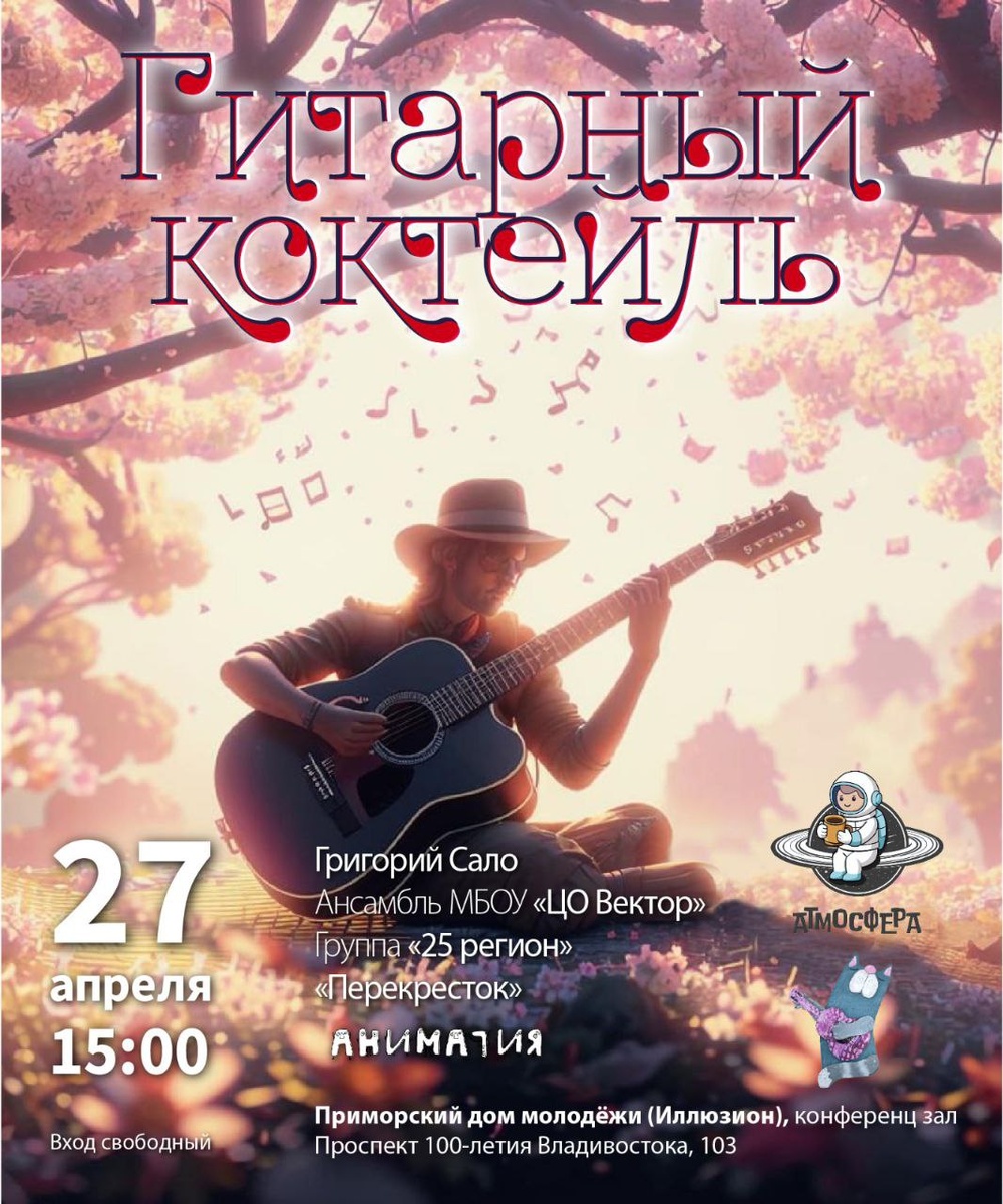 27 апреля в Приморском краевом доме молодежи пройдет концерт «Гитарный Коктейль»! Вход свободный. Вас ждёт разнообразная музыка: Старинные композиции на лютне. Классические и современные произведения. Энергичные рок-хиты. Участники концерта: Ансамбль МБОУ "ЦО Вектор". Руководитель Вадим Максимов. Рок-группа "25 регион", "Перекресток". Руководитель Анастасия Журавлёва. Детская мультстудия "Анимагия" Подростковый центр "Атмосфера". Солисты: Григорий Сало (гитара, лютня) Валерия Космылева (вокал). Начало в 15:00
