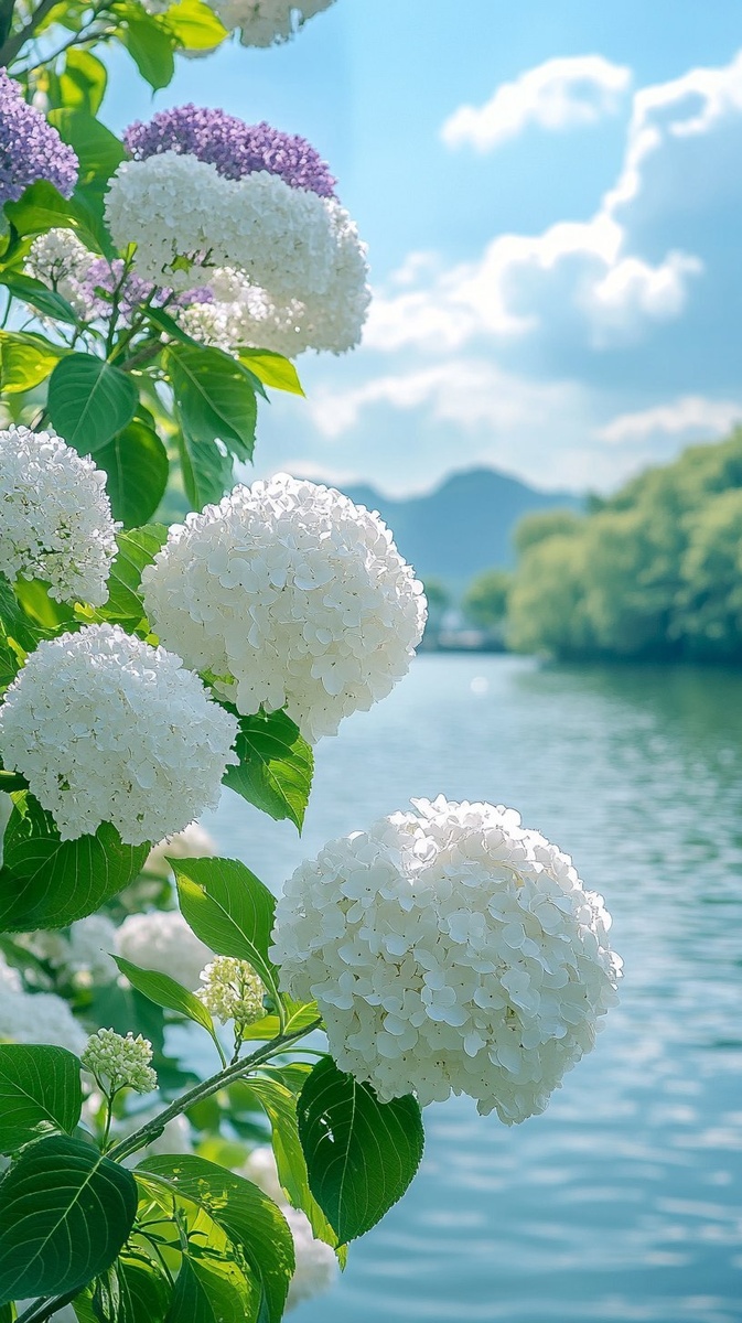 Создано на основе запроса: An ultra-wide panoramic view of West Lake in Hangzhou during summer: white hydrangeas bloom on green branches, with their large, round flower heads hanging down gracefully. The background features a vivid blue sky and glistening lake water. Captured in a realistic photography style using natural light, the image showcases high-definition photographic quality with superb details, a pronounced depth of field effect, and is shot through a telephoto lens, preserving the serene beauty of the scene in sharp clarity. --- Автоперевод: Летом ультраизорамный вид на Западное озеро в Ханчжоу: белые гортензии цветут на зеленых ветвях, с изящным висящим головками с круглыми цветами. Классно получилось? 🤔 https://dzen.ru/id/65c0c65c86e4f837c27b24d7 #ИИ #AI #нейросеть #midjourney #art